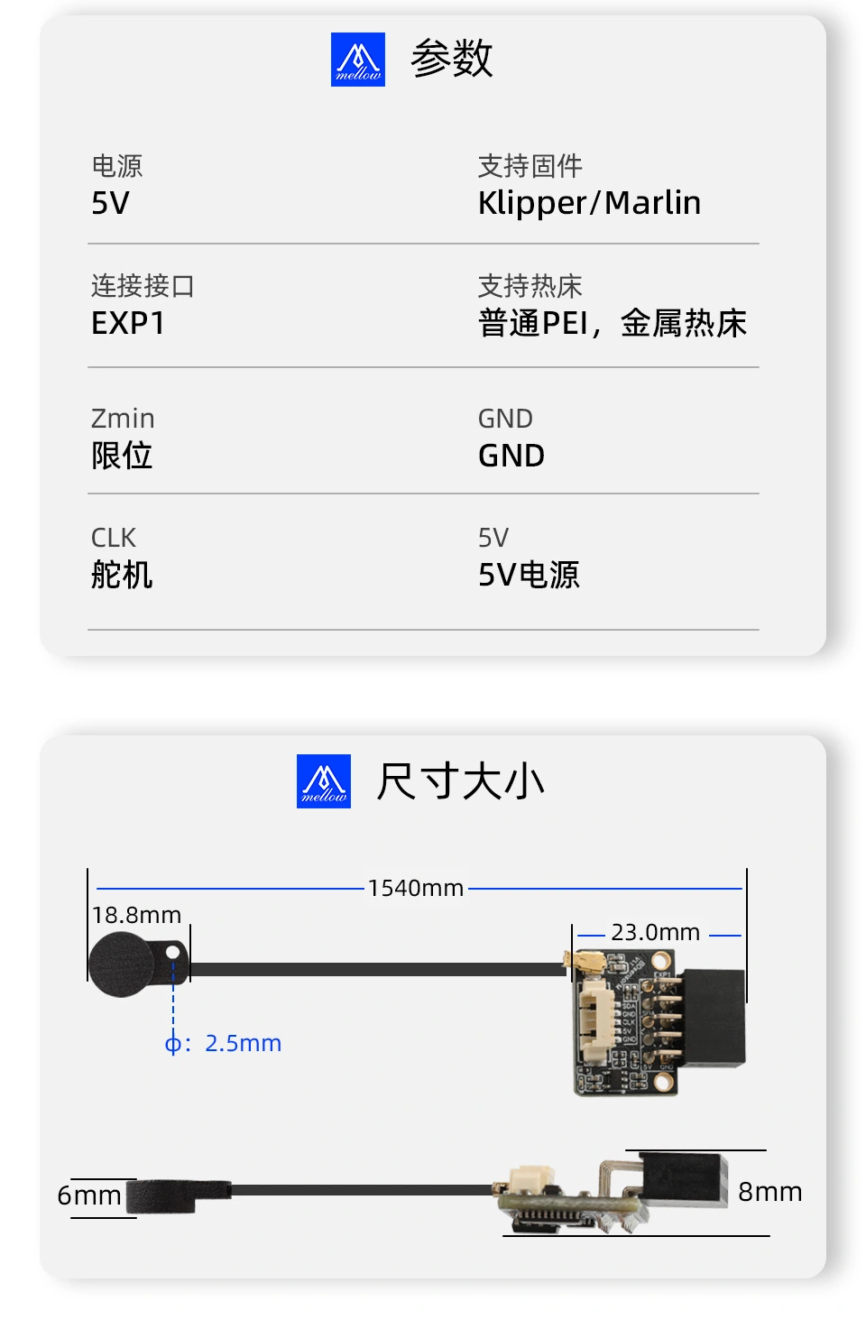 모듈 & 확장 보드 클래스BDsensor-m설치 가이드이 페이지에서팁 BDsensor-m는 메인보드의 EXP1 및 BL-TOUCH* 인터페이스를 직접 사용할 수 있습니다. 주의사항 라인의 순서가 올바른지 주의하세요, 그렇지 않으면 장치가 손상될 수 있습니다. BDsensor-m 크기 라인 순서 배치 BDsensor-mBL-TOUCH기능 소개SDAZmin제한GNDGNDGNDSCLK서보5V5V5V 전원GNDGNDGND 설치 도식도