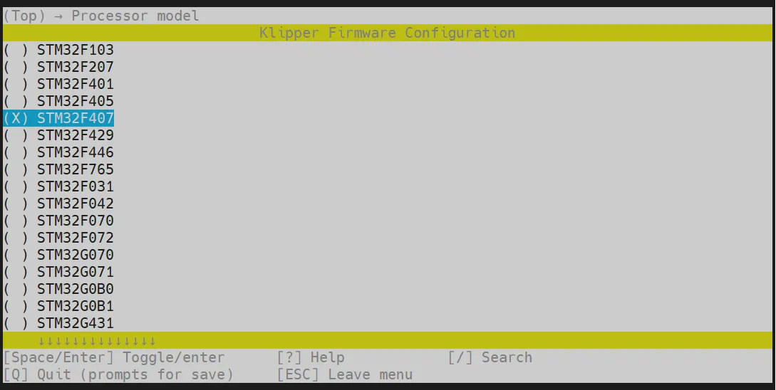 cd ~/klipper && rm -rf ~/klipper/.config && rm -rf ~/klipper/out && make menuconfig -