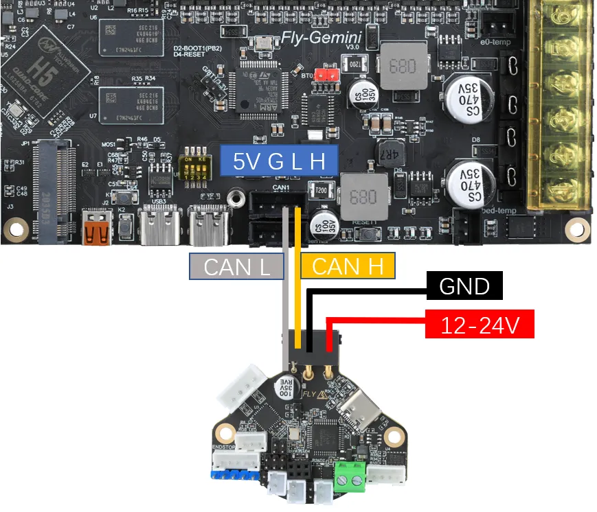 - 도구 보드의 전원 선은 CAN 포트에 연결되는 것이 아니라 12V-24V 전원 선에 연결됩니다.