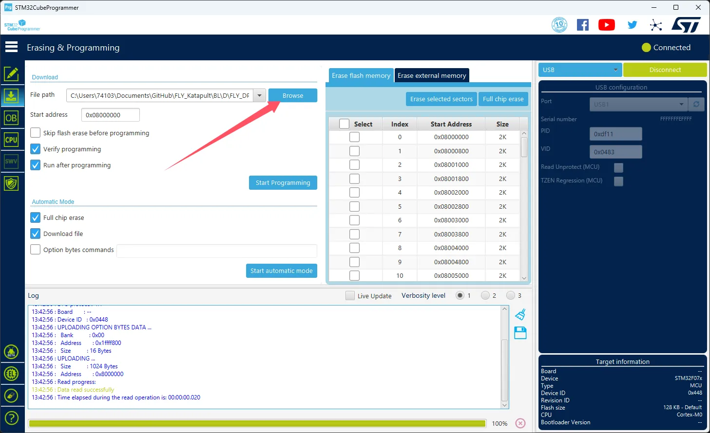 - STM32CubeProgrammer에서 USB 모드 선택 후 새로고침, 연결