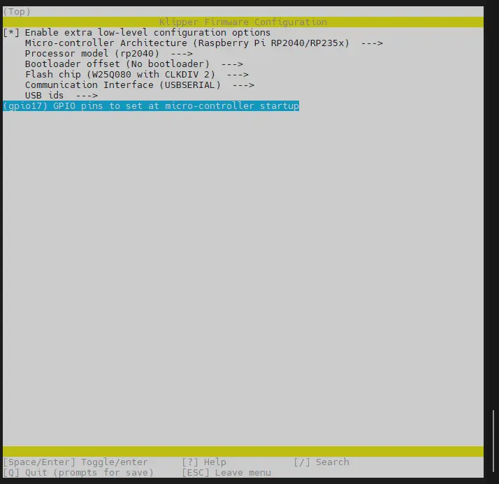 cd ~/klipper && rm -rf ~/klipper/.config && rm -rf ~/klipper/out && make menuconfig -