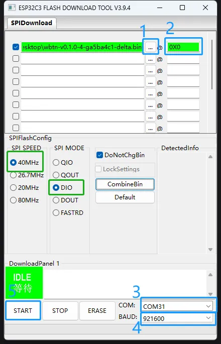 - 点击上图中的蓝色区域1按钮选择你烧录的固件