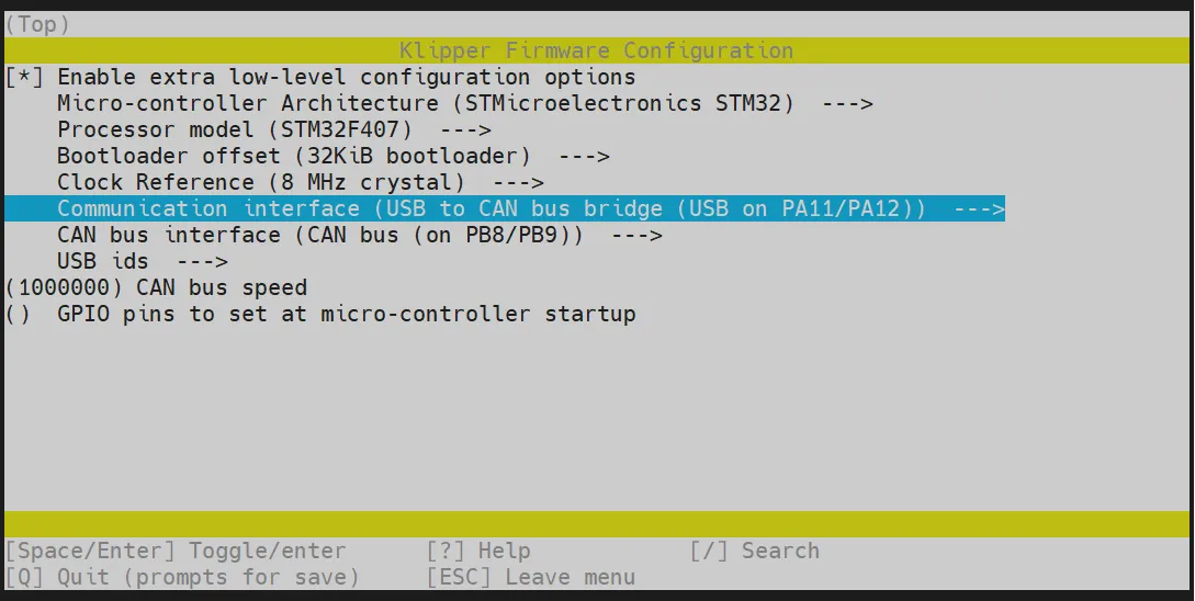 cd ~/klipper && rm -rf ~/klipper/.config && rm -rf ~/klipper/out && make menuconfig -