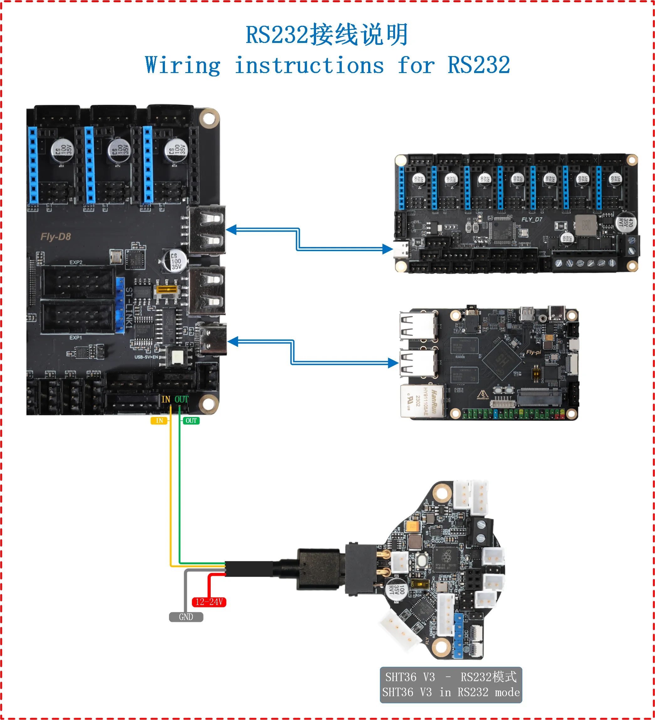 Обратите внимание, что линия питания инструментальной платы не подключается к линии сигнала RS232, а подключается к линии питания 12V-24V
