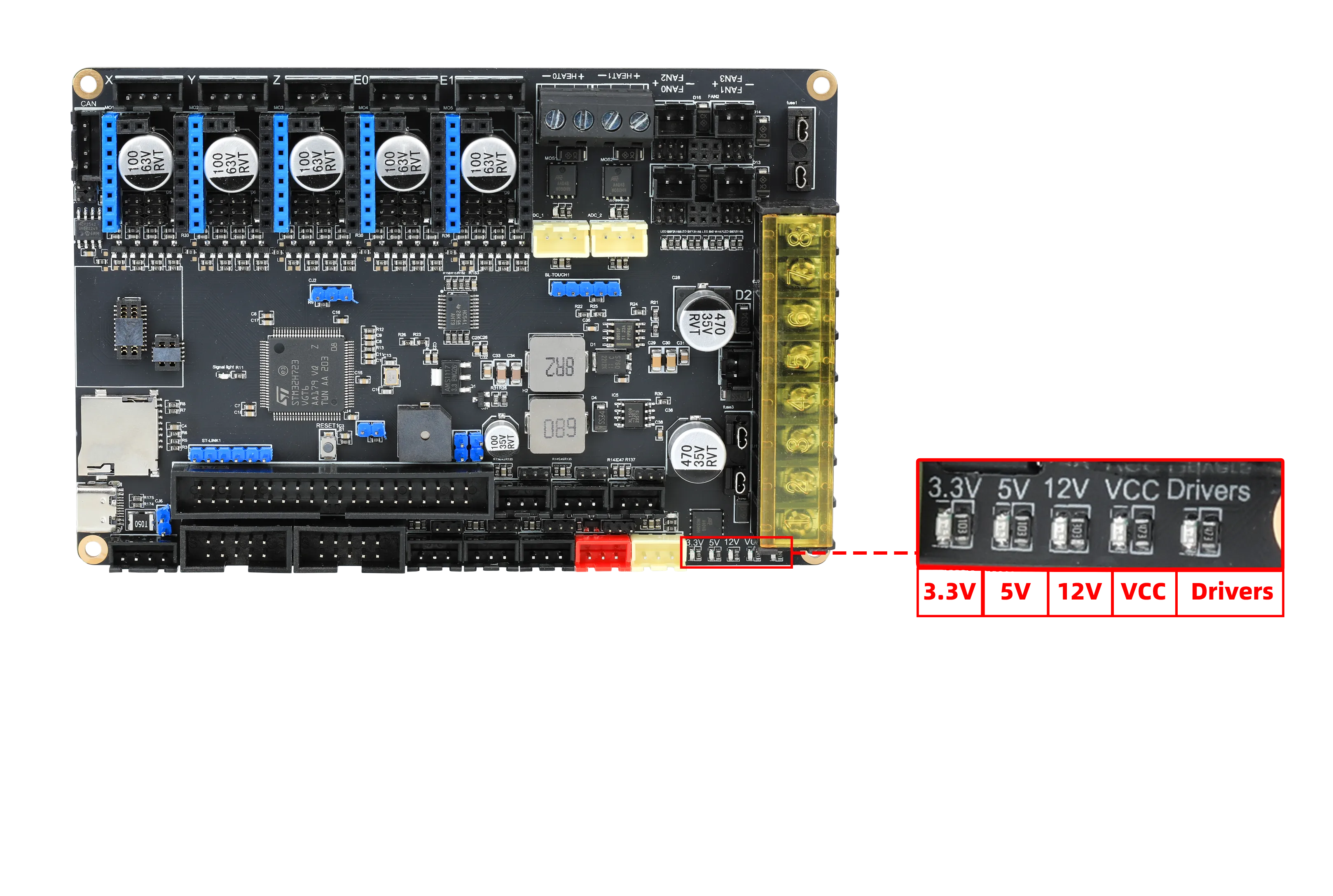 3.3V,5Vи12V - После подключения питания двигателей 0-2, двигателей 3-7 и нагревательного стола, индикаторы питания в левом нижнем углу материнской платы загорятся нормально