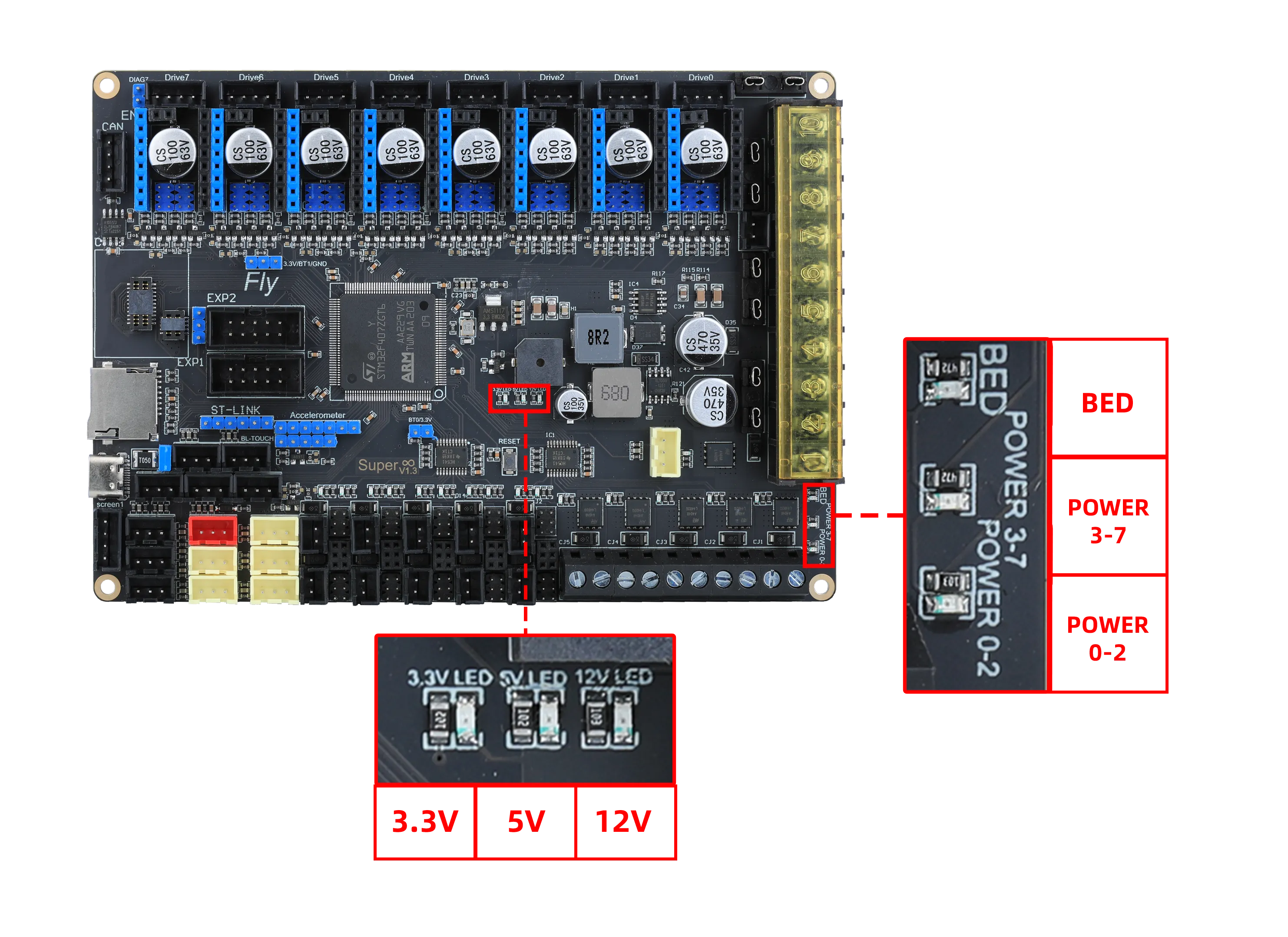 3.3V,5Vи12V - После подключения питания для двигателей 0-2, двигателей 3-7 и нагревательного стола, индикаторы питания в левом нижнем углу материнской платы загорятся