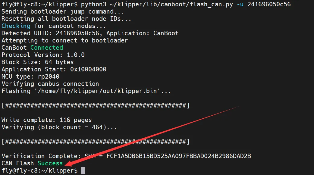 241696050c56в следующей команде на найденный UUID, обратите внимание на пробел после-upython3 ~/klipper/lib/canboot/flash_can.py -u 241696050c56 -