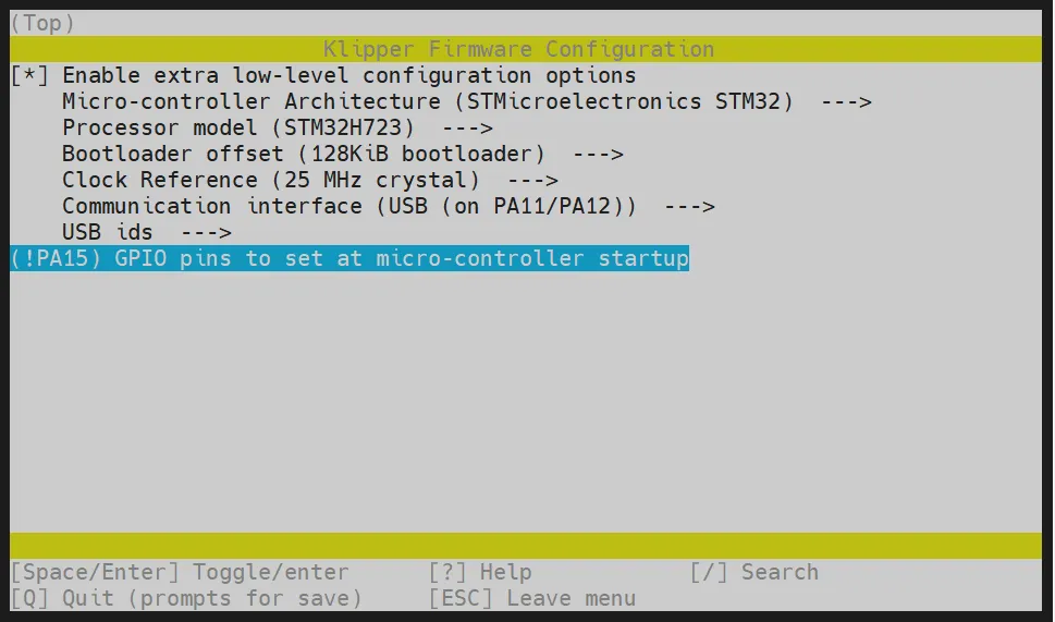 cd ~/klipper && rm -rf ~/klipper/.config && rm -rf ~/klipper/out && make menuconfig -