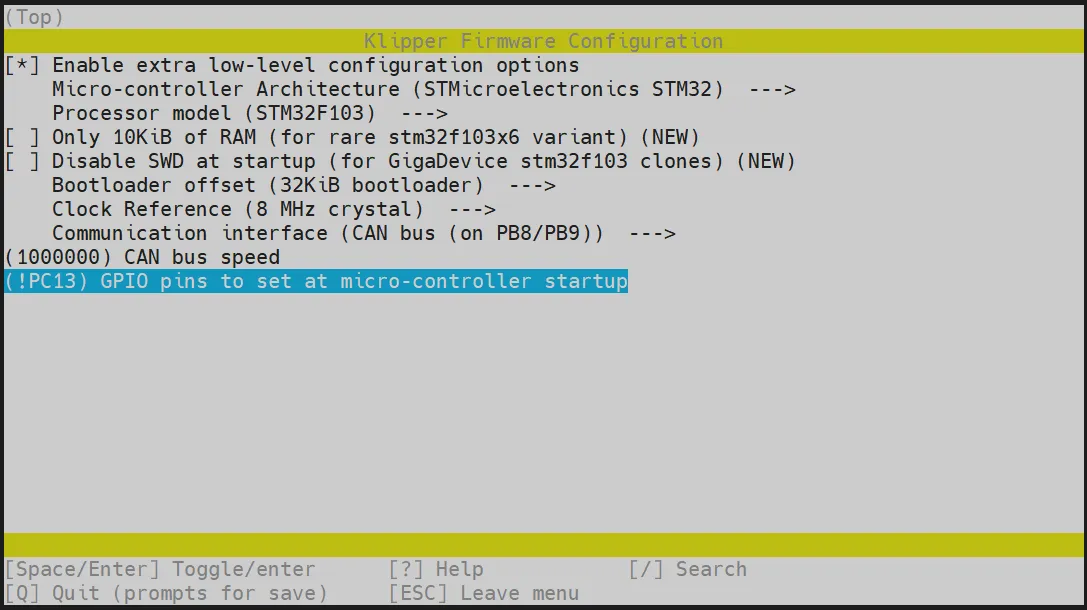 cd ~/klipper && rm -rf ~/klipper/.config && rm -rf ~/klipper/out && make menuconfig -